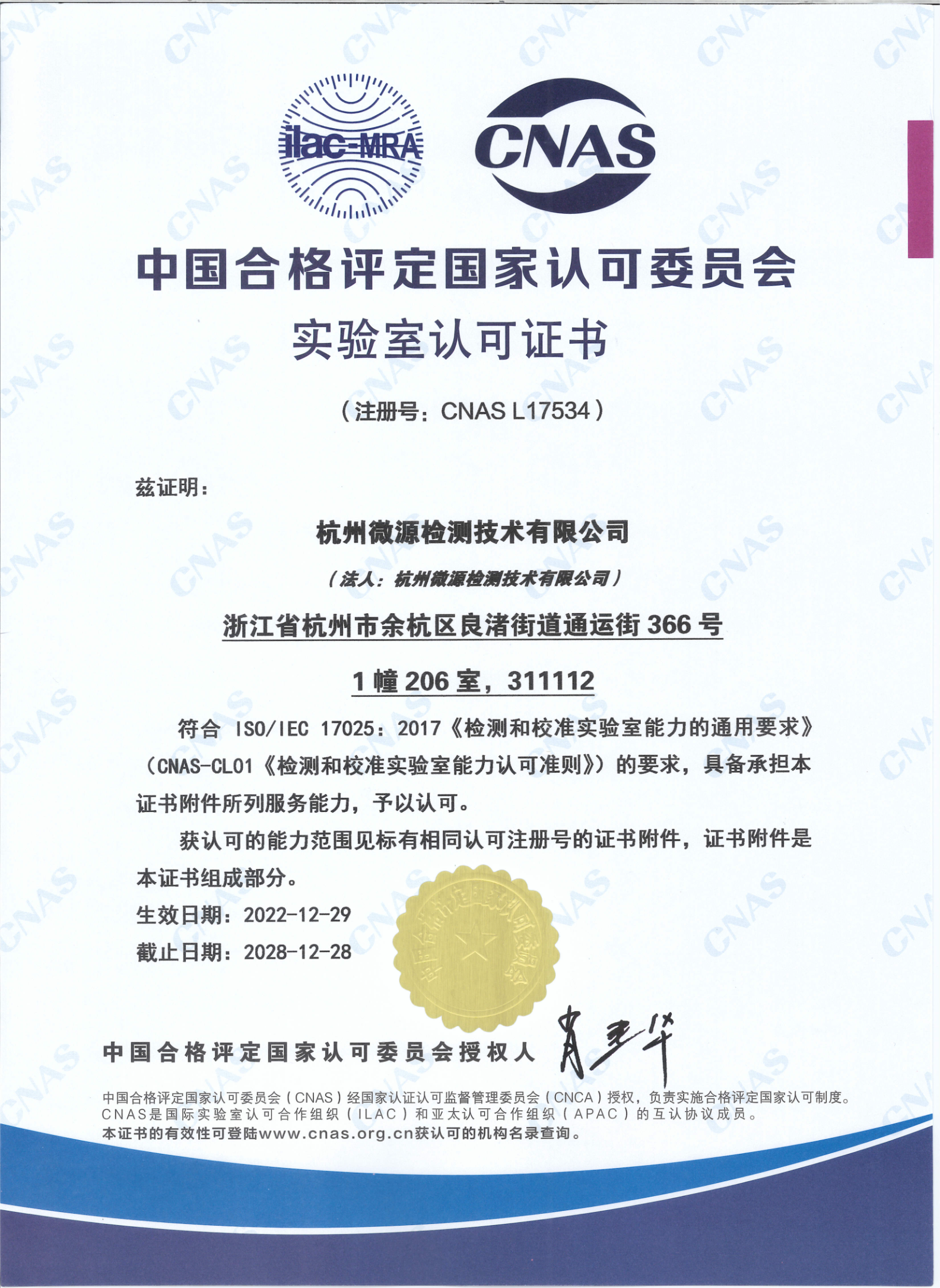 微源检测遵照 ISO 17025和 GMP 进行实验室管理,申请并通过了中国计量认证(CMA),CNAS资质认定。公司质量保证部全面把控合规性审计和文件系统控制等, 通过专业化的质量体系控制软件对公司质量管理系统,包括文档管理、人员培训、内外部审计以及偏差等质量事件的管理,对仪器管理与验证等进行全方位的监控。仪器设备验证均经过 IQ/OQ/PQ 验证,并建立相关仪器操作规程和计量认证。